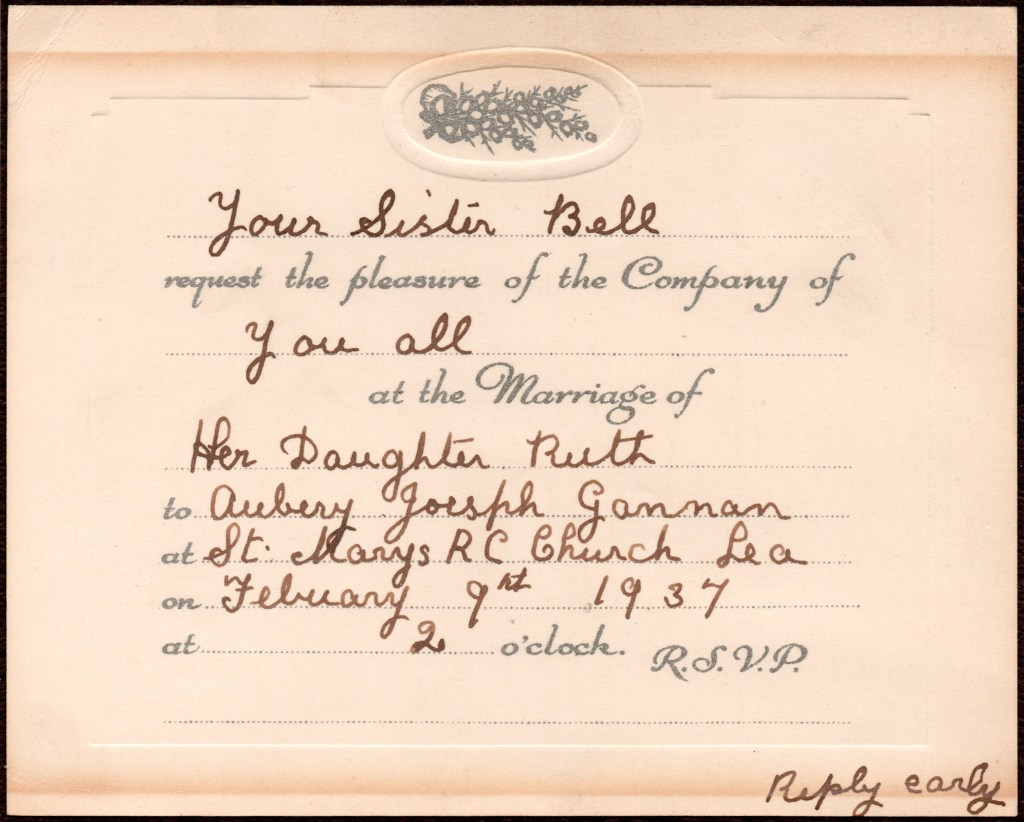 The wedding of Joe and Ruth took place at St Mary’s Roman Catholic Church, Lea, Lancashire, on 9th February 1937 at 2 o’clock.